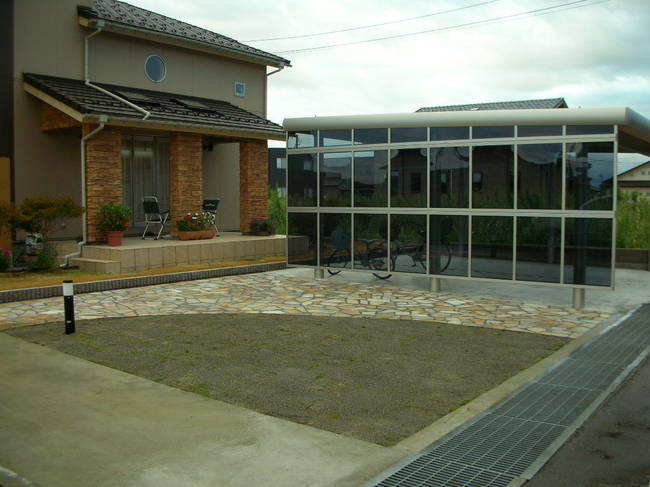 | アピールポイント | パールイエローという名の自然石です。1枚として同じものが無い乱形の平たい自然石を丁寧に並べていきます。 手前に見える砂みたいのは、芝生を張った場所です。芝生の目土は川砂でもOKです。 |